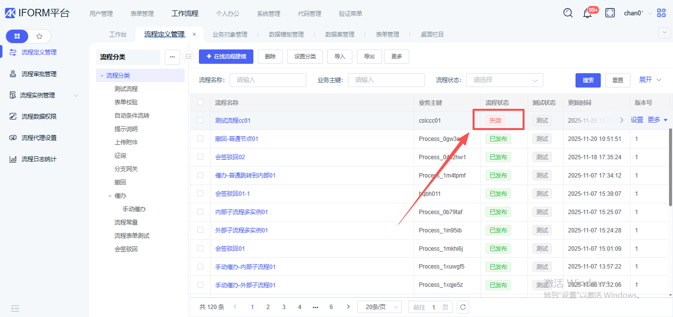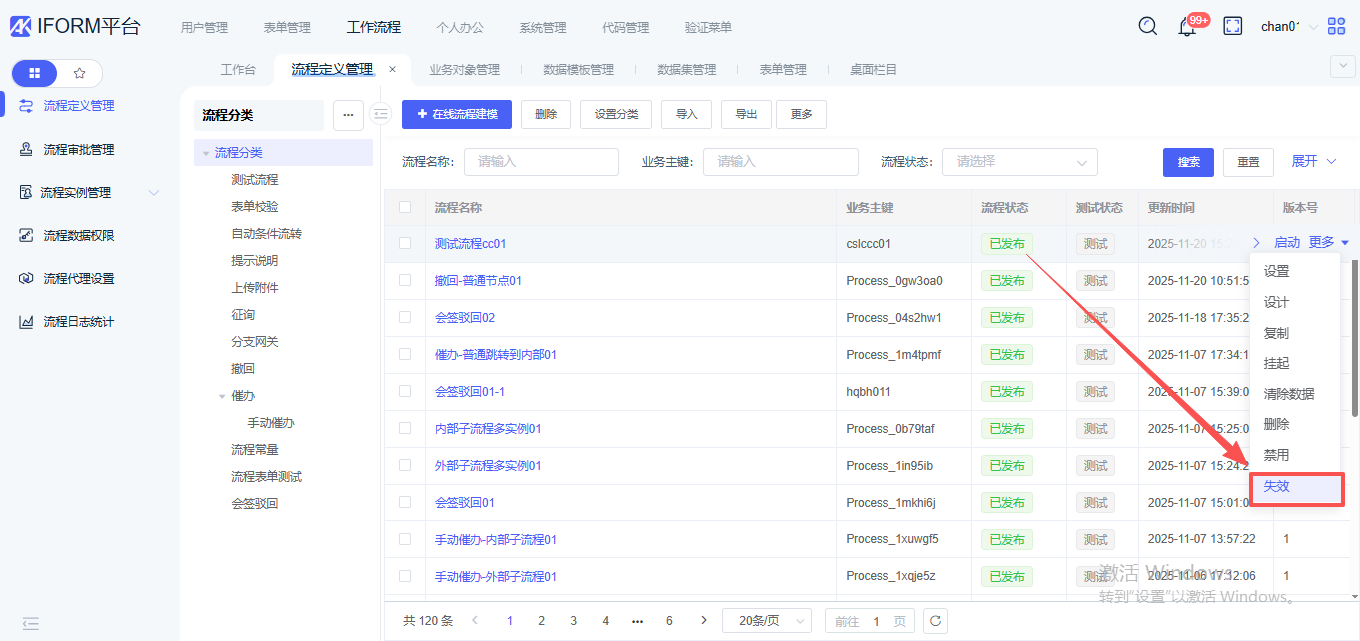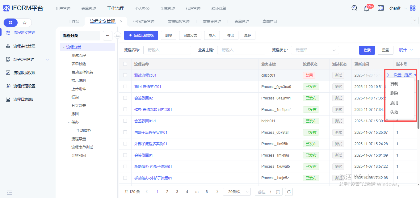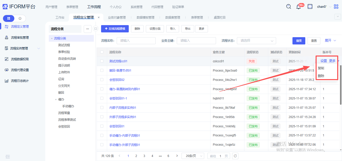流程状态为【失效】时,流程定义只能进行【设置】、【复制】、【删除】操作