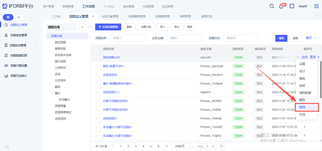 1、禁用状态:已发起的流程实例不受影响,禁用之后不能在发起流程,即启动新的流程实例。