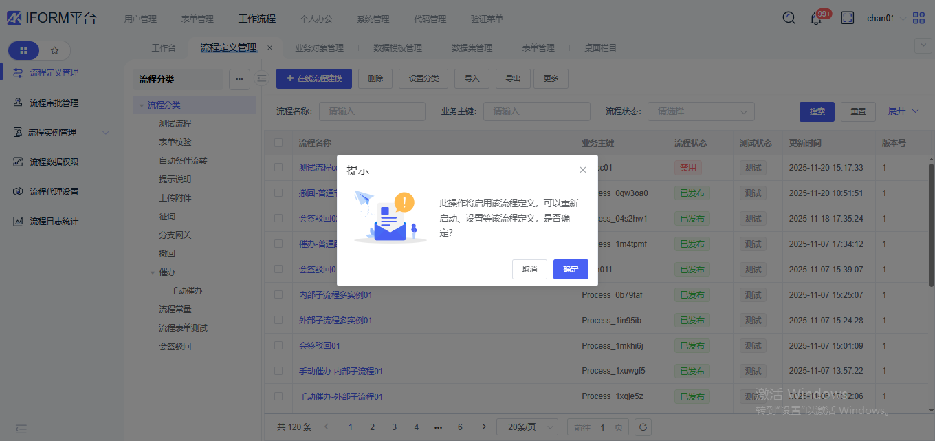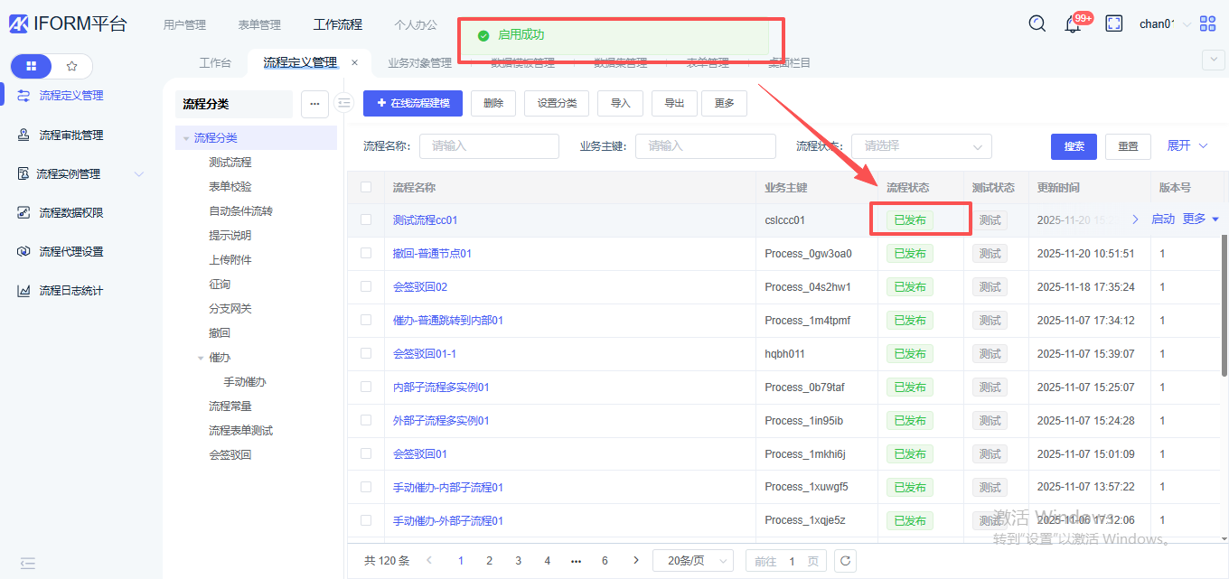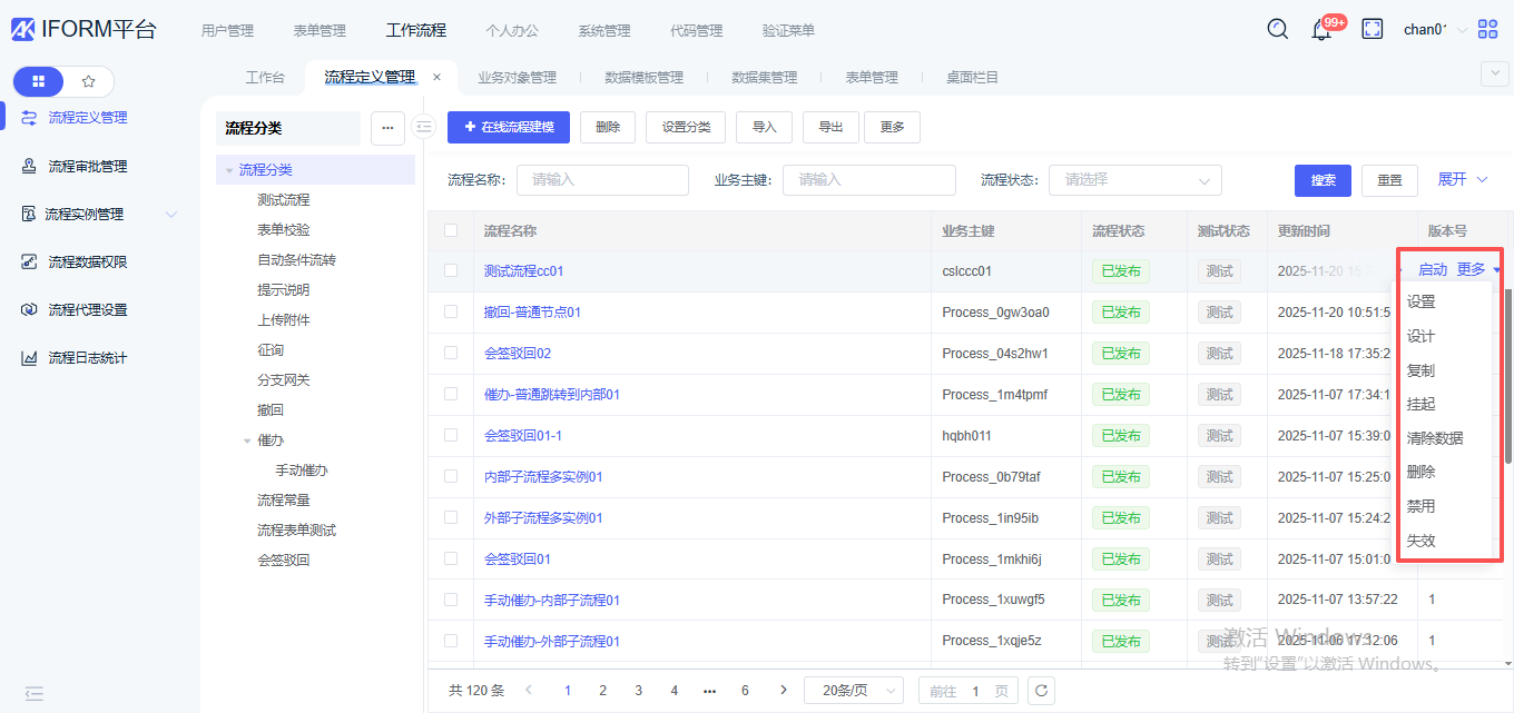 成功启动后,可正常对流程进行启动、设计、挂起等操作