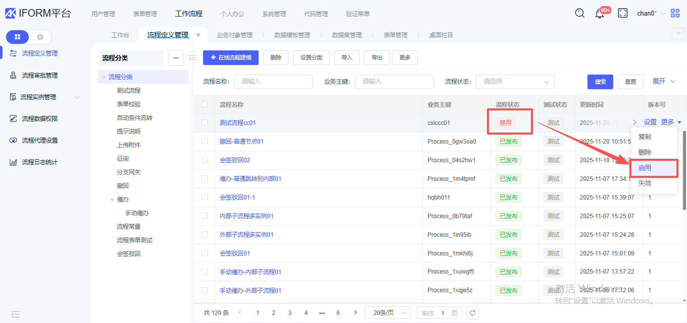流程状态为【禁用】时,流程定义只能进行【设置】、【复制】、【删除】以及【启用】、【失效】操作