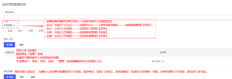 给用户、角色、组织、岗位配置工作流程管理模块的权限。在【流程数据授权】给用户、角色、组织、岗位配置相关属性后,用户才能看到对应的流程信息。