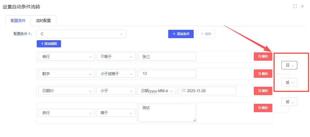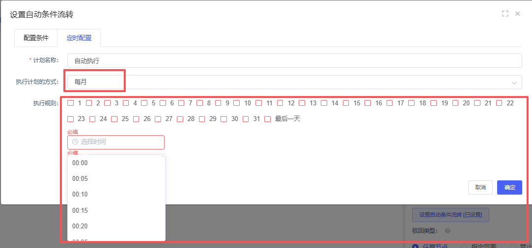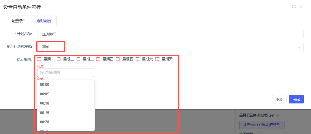 是否设置自动条件流转:根据配置定时计划时间触发该配置满足条件的进行自动流转。
