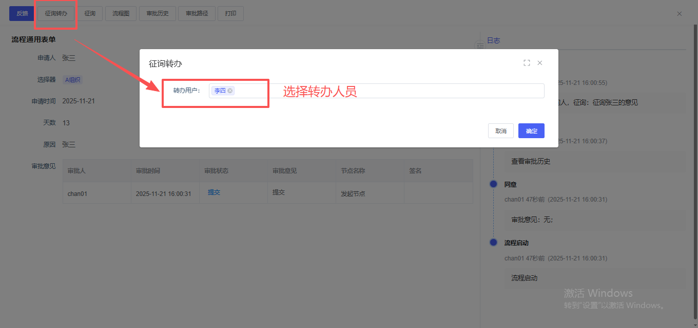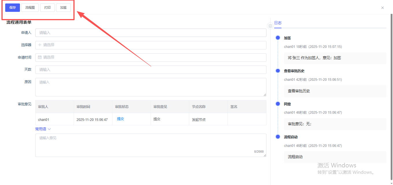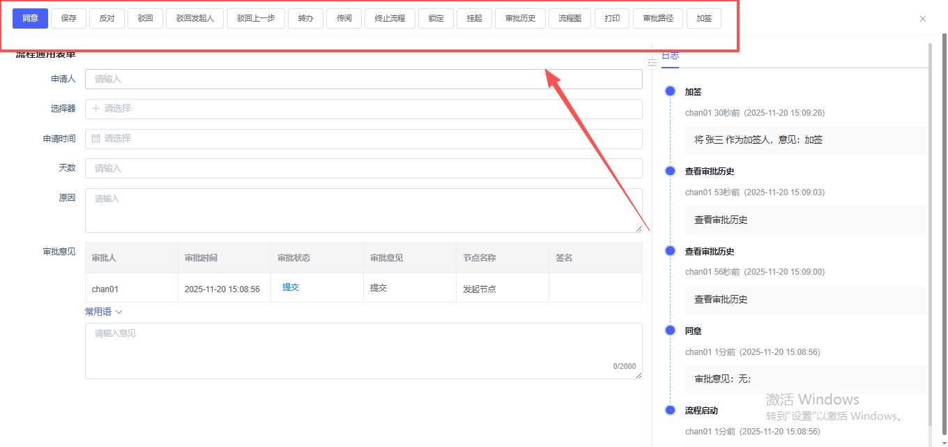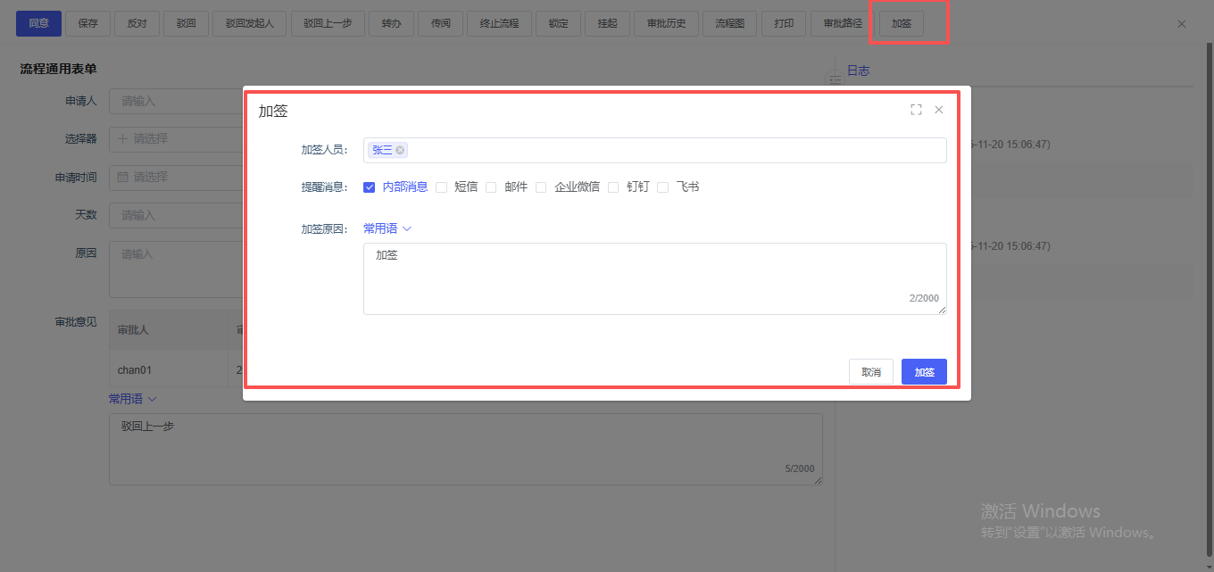 会签特权:可以配置权限来执行对应操作【直接处理会签节点,一票制度【一票同意、一票否决】,补充审批人员等等】