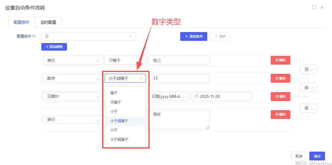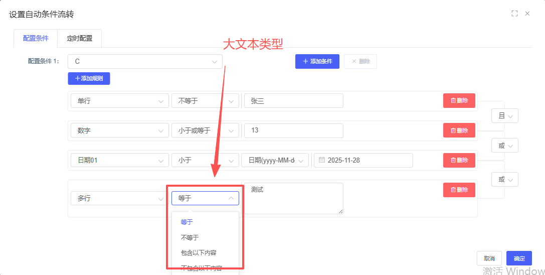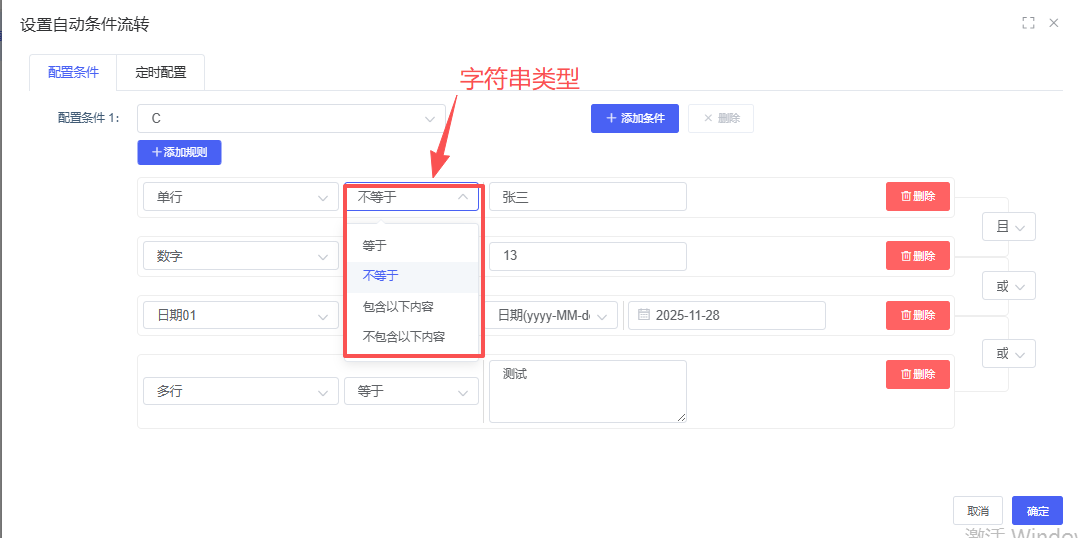 ②条件表单式:字符串类型条件有等于、不等于、包含以下内容、不包含以下内容;数字类型有等于、不等于、小于、小于或等于、大于、大于或等于;日期类型有小于、小于或等于、大于、大于或等于;大文本类型有等于、不等于、包含以下内容、不包含以下内容
