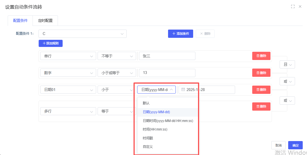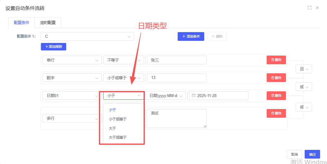 ③日期型:小于、小于或等于、大于、大于或等于【支持日期(yyyy-MM-dd)、日期时间(yyyy-MM-dd HH:mm:ss)、时间(HH:mm:ss)、时间戳、自定义类型的日期】
