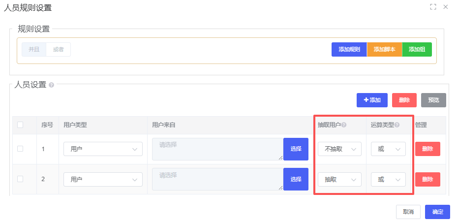 人员设置:人员设置中,“排除”和“与”运算符的用户类型、抽取用户的选项值必须和其它序号中的其中一行的用户类型值、抽取用户值一致才能进行运算。