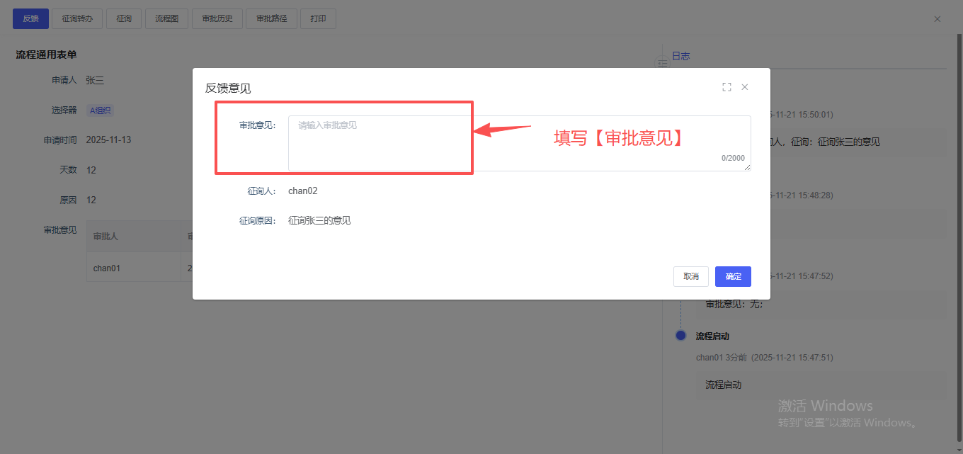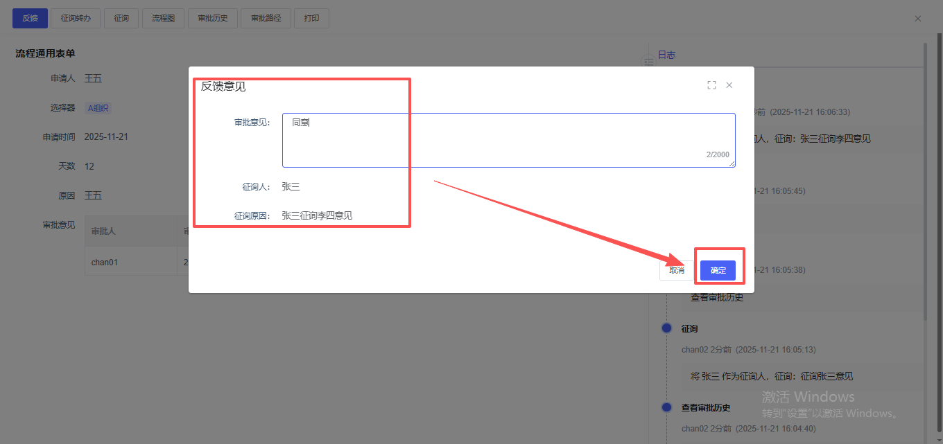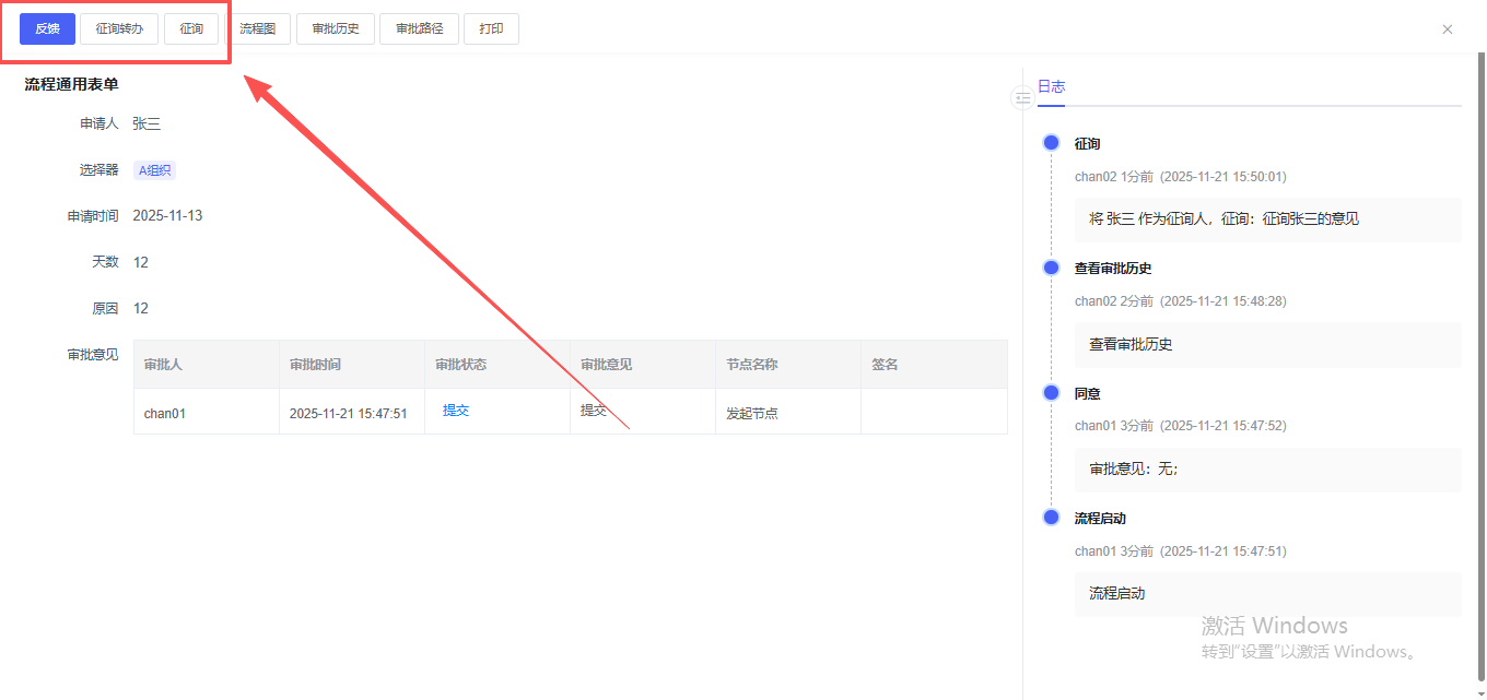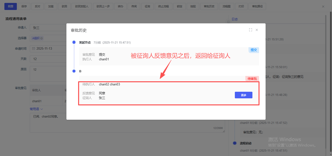 • 当流程发起之后,当“C”节点驳回到“B”节点,此时进入“B”节点的审批界面可以继续驳回到“A”节点操作;