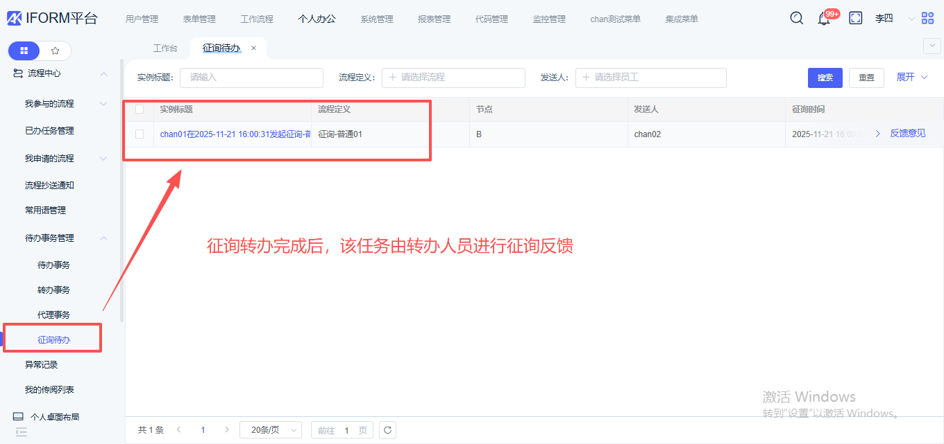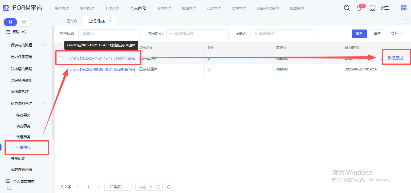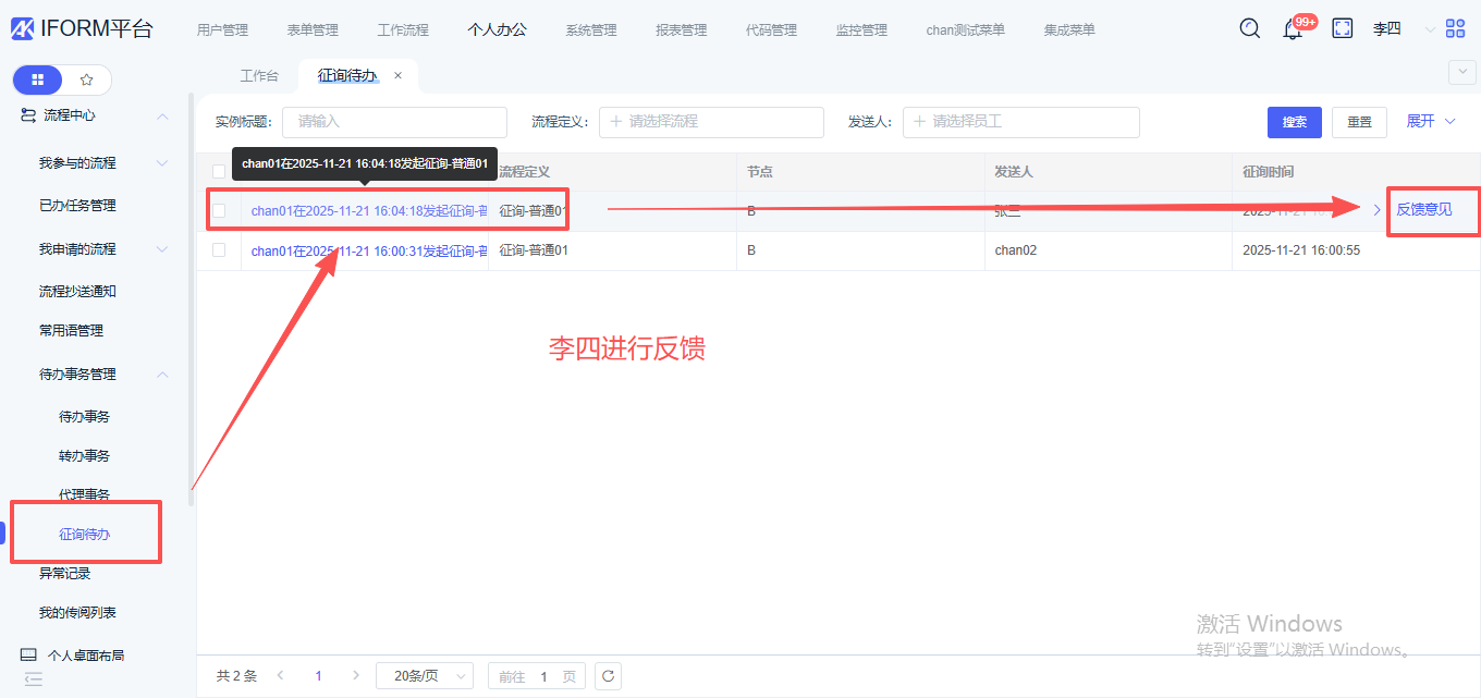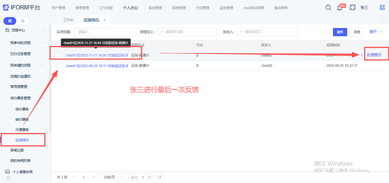 • 当流程发起之后,当“C”节点驳回到“B”节点,此时进入“B”节点的审批界面可以继续驳回到“A”节点操作;