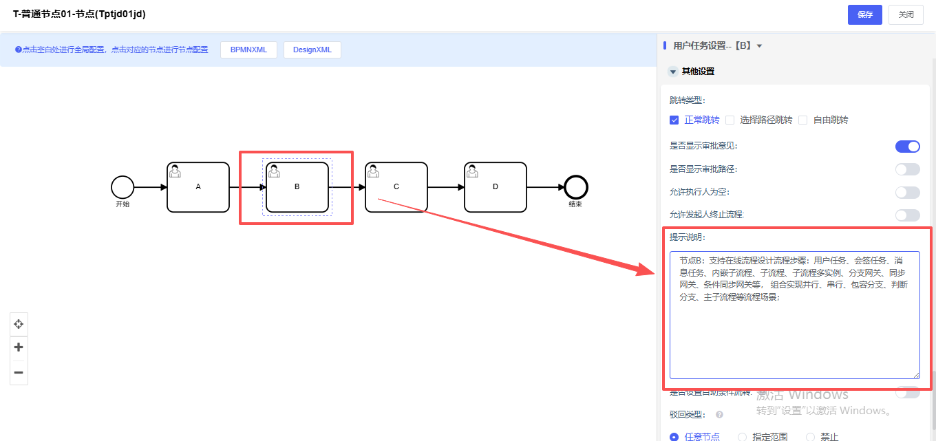 注意:在单个节点设置时,则以单个节点提示的内容为主,没有配置内容则以全局写提示说明为主,除了审批节点提示显示。