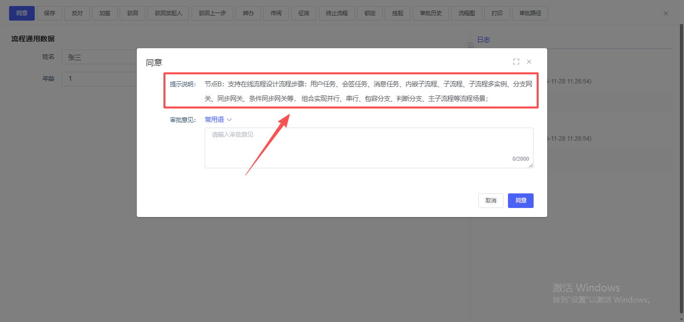 设置完成后,审批人在审批流程时显示该节点提示说明信息
