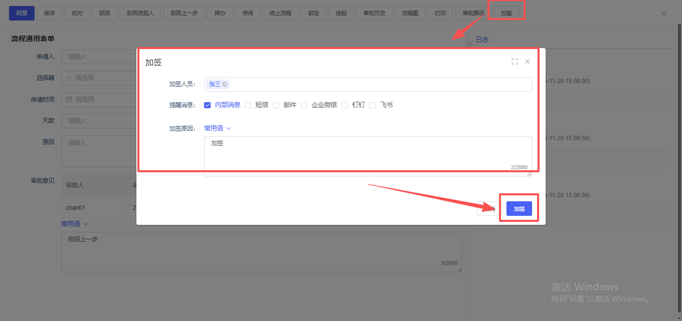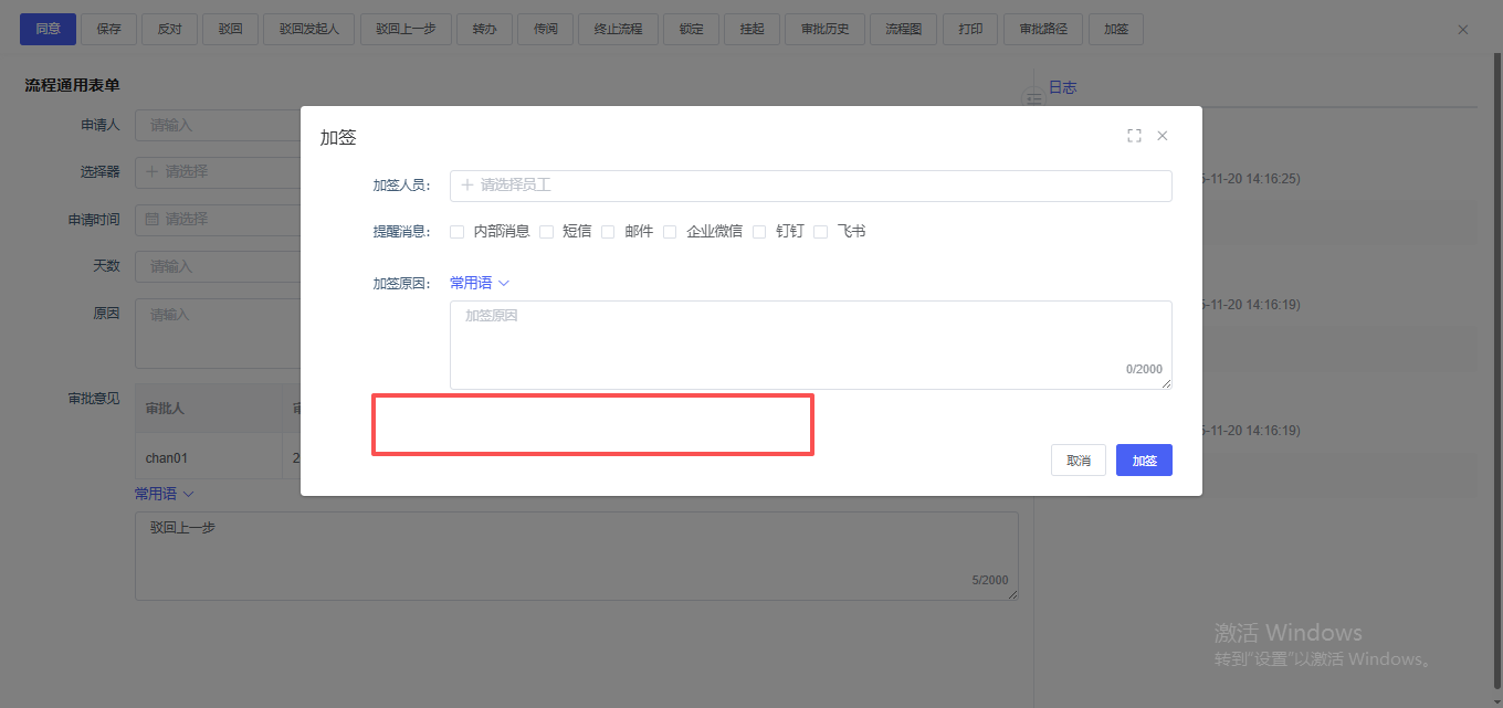 其他设置:配置全局通知类型、是否允许连续驳回、显示选在用户、手写签名、允许执行人为空!