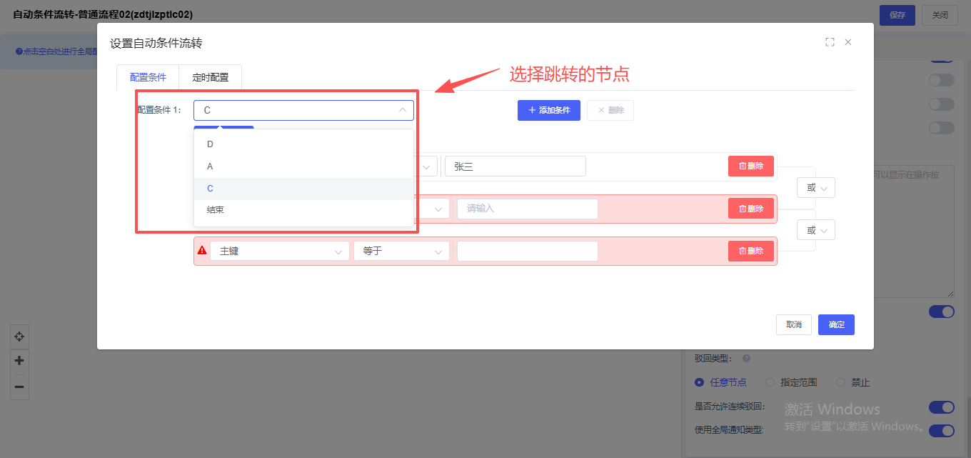 (1)选择跳转的节点:当满足设置的规则时,自动跳转到设置的节点;