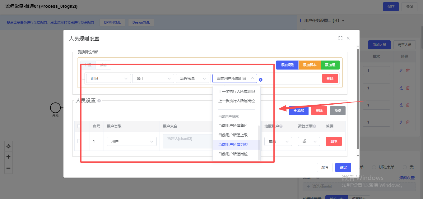 上一步执行人所在组织:获取上一个节点审批人所在组织的全部人员