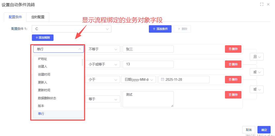 (2)添加规则:可添加多个条件,多个条件间的逻辑关系可以是所有都满足或者满足任意一个。