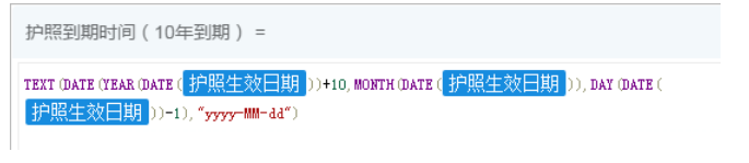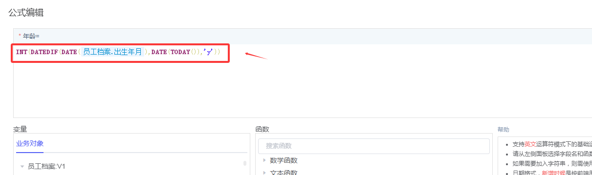 目录 搜索 展开 新手入门第一个流程用户管理员工管理等级管理组织管理岗位管理角色管理分级组织管理参与者属性管理用户组管理上下级管理员工回收站表单管理业务对象管理接口导入模式表单管理表单控件布局控件基础控件基础控件操作增强控件增强控件操作容器控件系统控件流程控件自定义控件组合控件报表控件其他控件大纲树表单套件业务对象表单属性特色功能表单样式详情表单管理套件管理组合表单管理数据管理数据集管理数据模板管理模版类型:默认数据模板-待办列表数据模板:树形数据模板:组合模版类型:对话框模版类型:值来源导出任务列表表单脚本案例表单按钮-前置事件表单提交校验-后端唯一校验表单脚本-约束信息唯一性主表数据相关功能脚本子表数据相关功能脚本数据模板脚本案例自定义按钮-更新数据自定义按钮-删除数据表单公式函数案例工作流程流程定义管理在线流程建模会签节点内部子流程外部子流程分支网关同步网关条件同步网关子流程多实例设置按钮全局设置用户任务设置流程案例操作说明流程审批管理流程实例管理正在运行列表结束实例列表流程数据权限流程代理设置流程日志统计个人办公流程中心我参与的流程已办任务管理我申请的流程流程抄送通知常用语管理待办事务管理审批流程按钮异常记录我的传阅列表个人桌面布局内部通讯消息中心信息管理用户交接管理系统管理系统配置授权管理系统附件定时计划流水号管理桌面管理桌面栏目分类管理服务管理系统日志国际化管理系统日志管理常用菜单管理数据交接管理导出日志Groovy脚本使用说明SaaS管理租户管理租户审核版本升级日志iform-v3.6.0版本更新日志说明 暂无相关搜索结果! 阅读次数:37 本文档使用 MinDoc 发布 表单公式函数案例 1、根据出生日期自动计算出年龄2、计算两个日期之间的小时数、分钟数3、根据身份证计算男女性别4、护照的到期时间(10年到期)1、根据出生日期自动计算出年龄获取主表的出生年月信息,在调用DATE和DATEDIF进行计算日期的时差,然后再调用INT函数取整,配置公式如下图:2、计算两个日期之间的小时数、分钟数配置后的效果:3、根据身份证计算男女性别(1)身份证的第17位数为奇数的时候,返回“男”,否则返回“女”(2)身份证的第17位数为1,3,5,7,9的时候,返回“男”,否则返回“女”4、护照的到期时间(10年到期)作者:黄春艳 创建时间:2025-11-07 17:59最后编辑:黄春艳 更新时间:2025-11-28 15:39