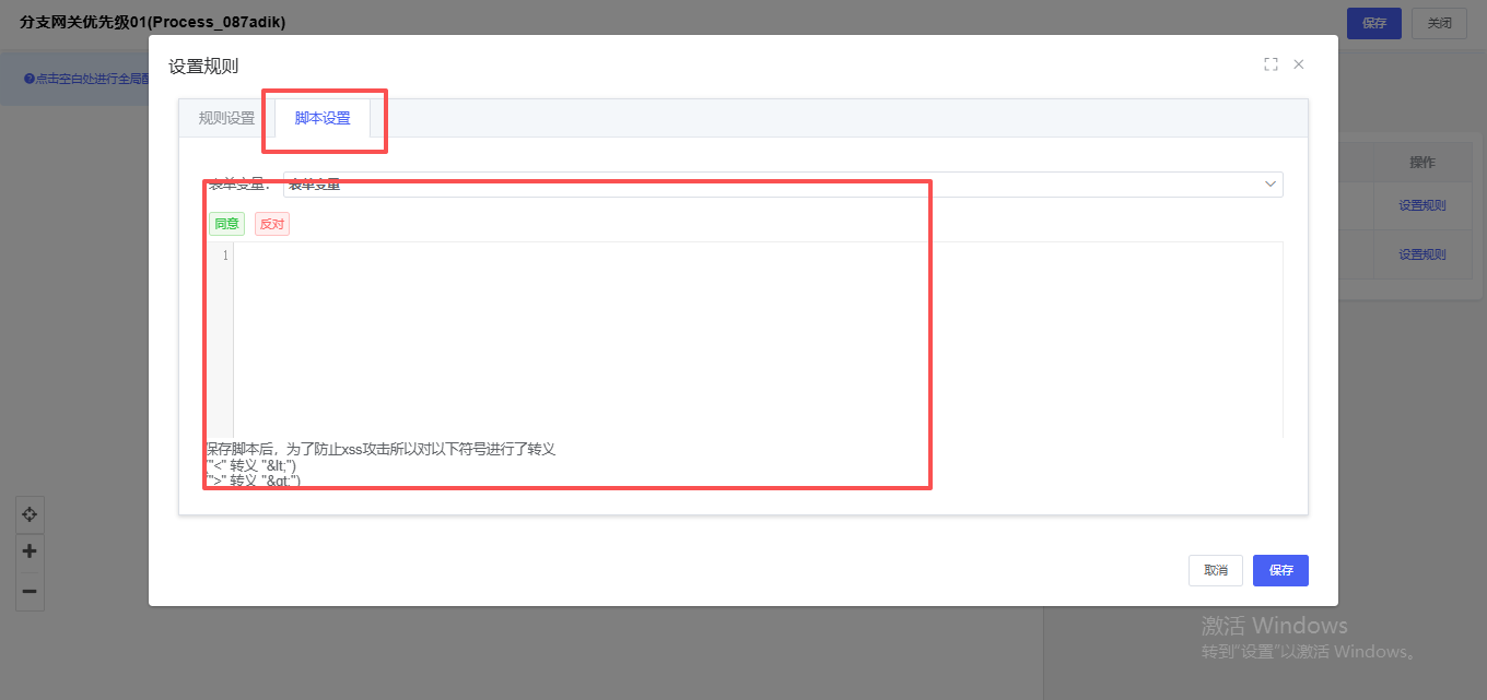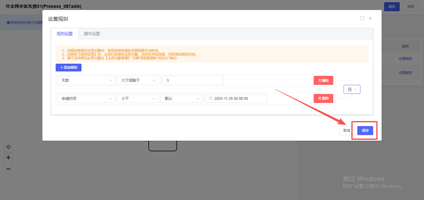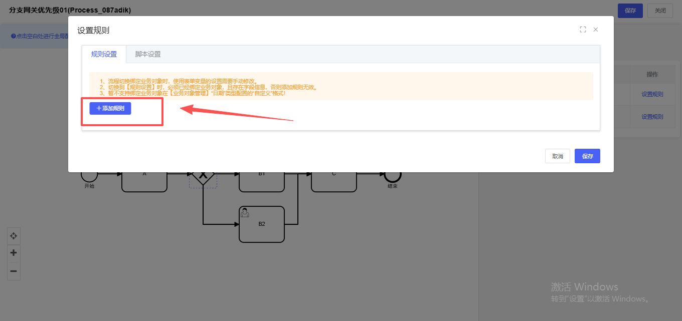(4)由【脚本设置】切换到【规则设置】时,必须已经绑定业务对象,且存在字段信息,否则添加规则无效;