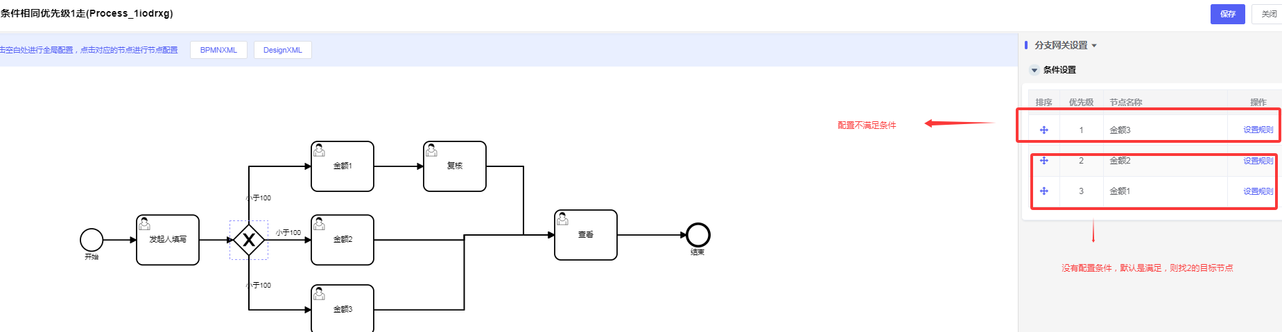 ①当分支网关不配置任何条件,默认条件都满足则走优先级1的目标节点;