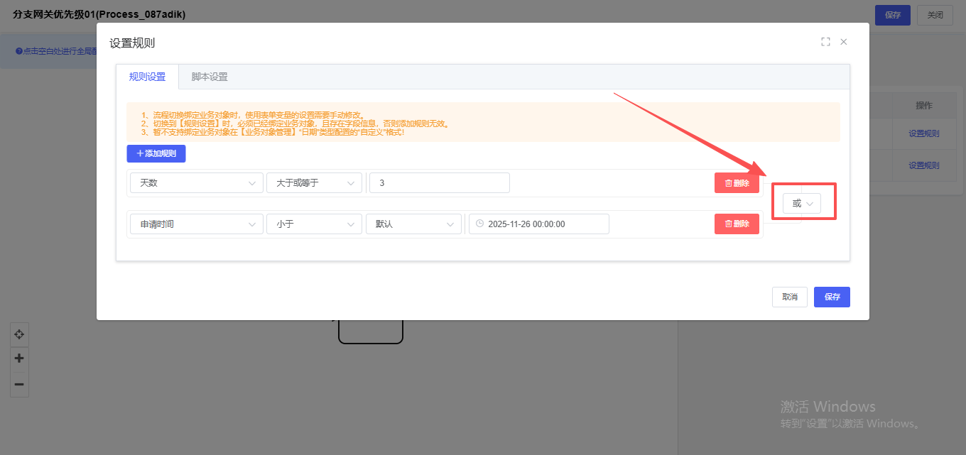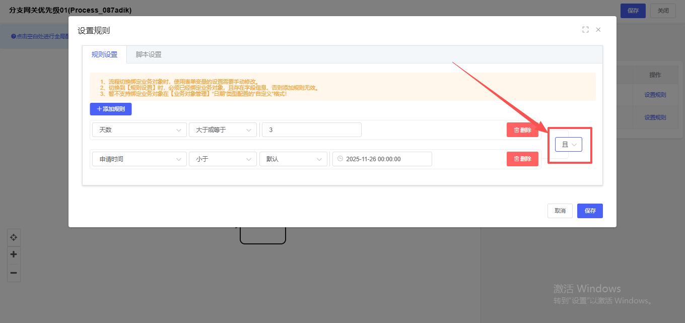 ①并且:所有条件必须同时满足流程才能流转到此分支。