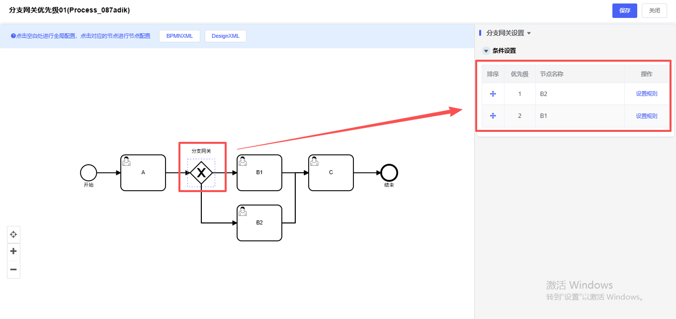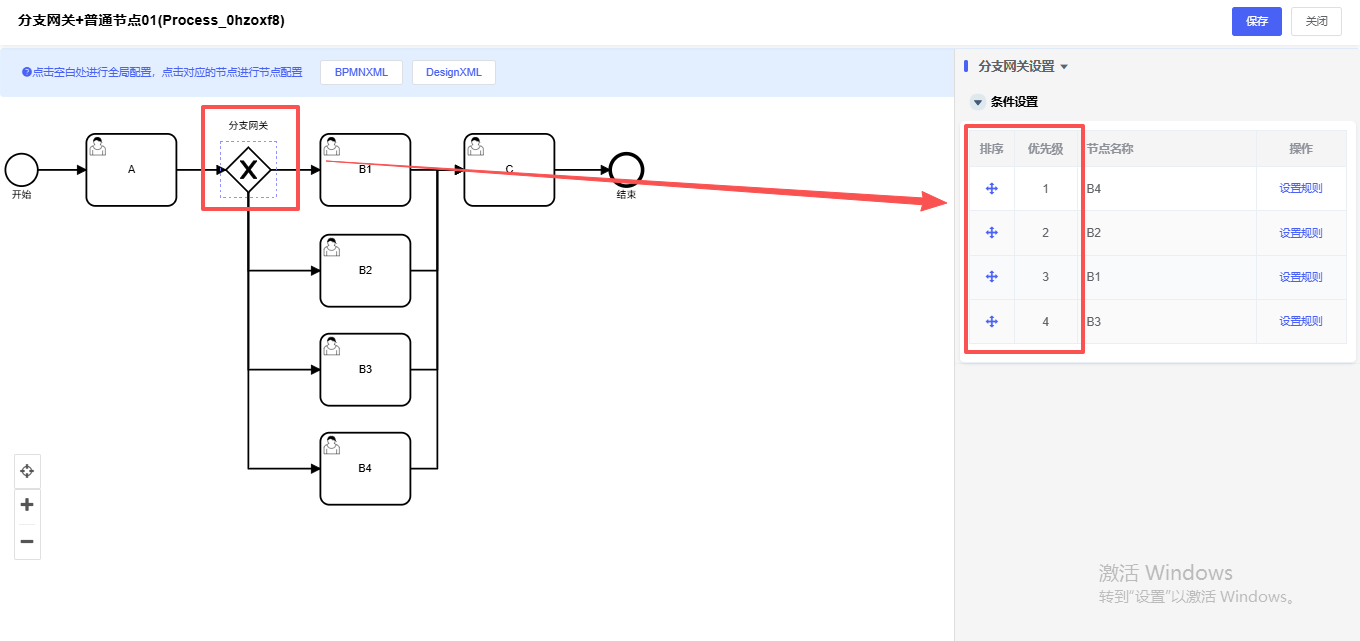 (1)排序:可以拖拽按钮进行重新排优先级的值,默认根据分支网关多条随机排优先级;