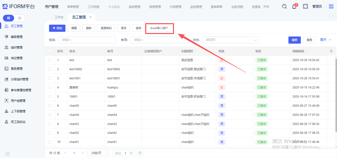 【员工管理】界面,点击“Excel导入用户”功能按钮,选择文件导入,即可进行用户导入。