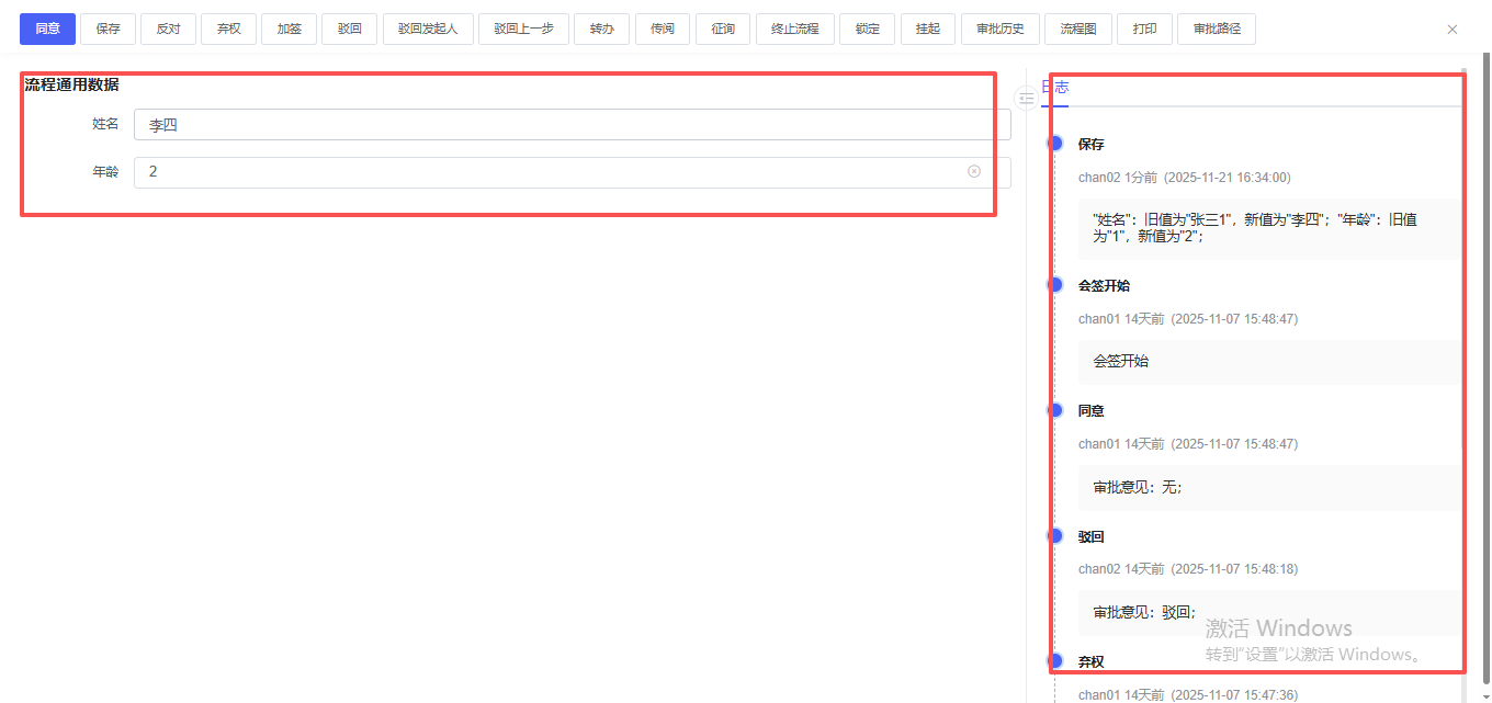 流程待办审批页面,已办流程实例页面页签显示:左边为表单,右边为流程操作日志。