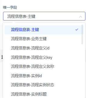 在模板设计配置页面,选择“模板属性”往下滑动再选择“唯一字段”为“流程信息表-主键”字段信息,如下图: