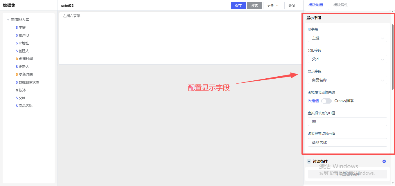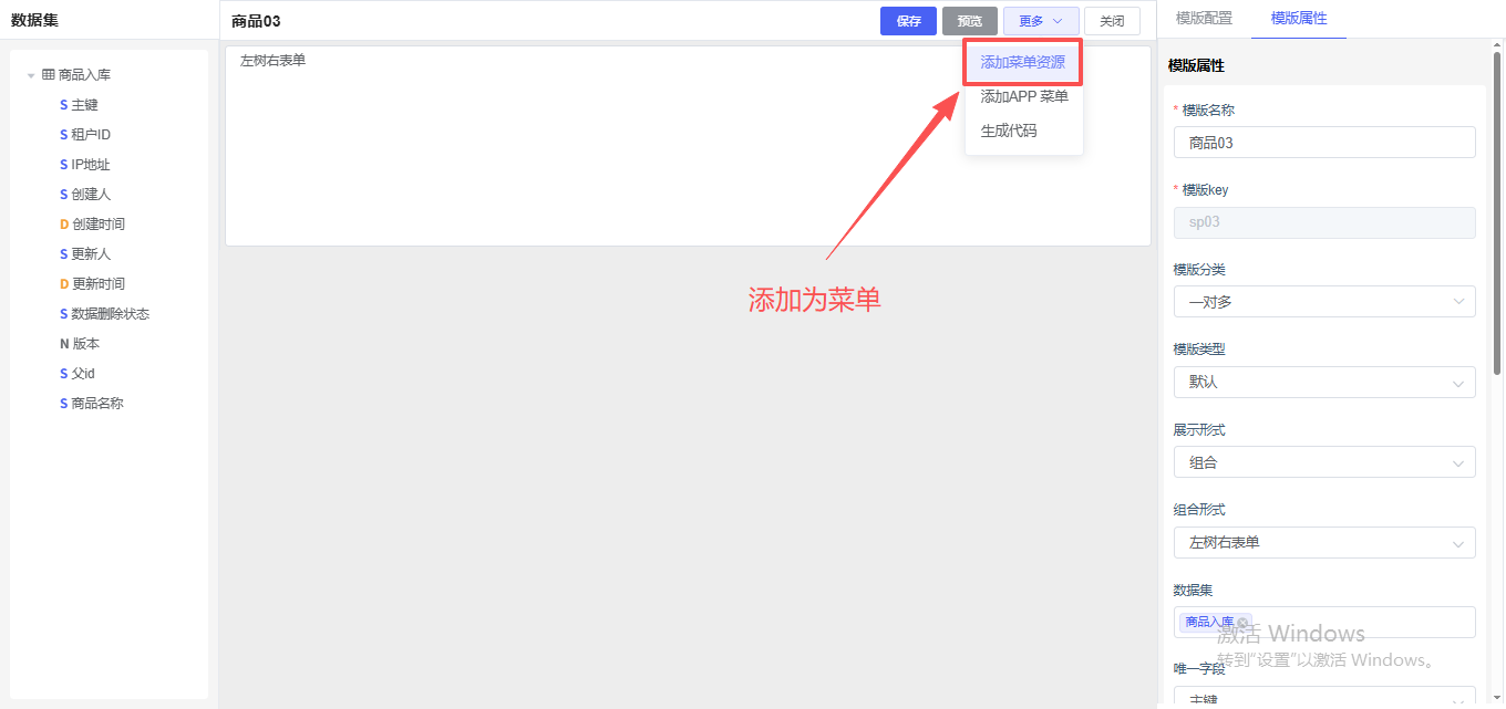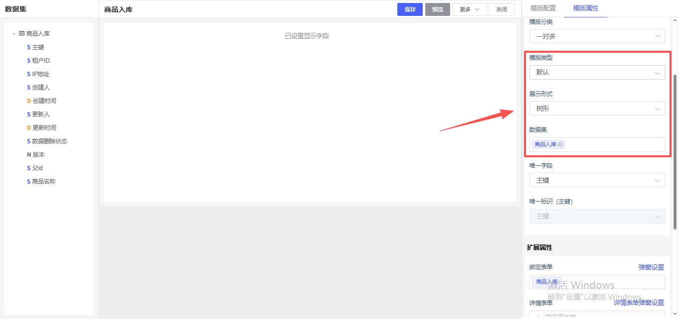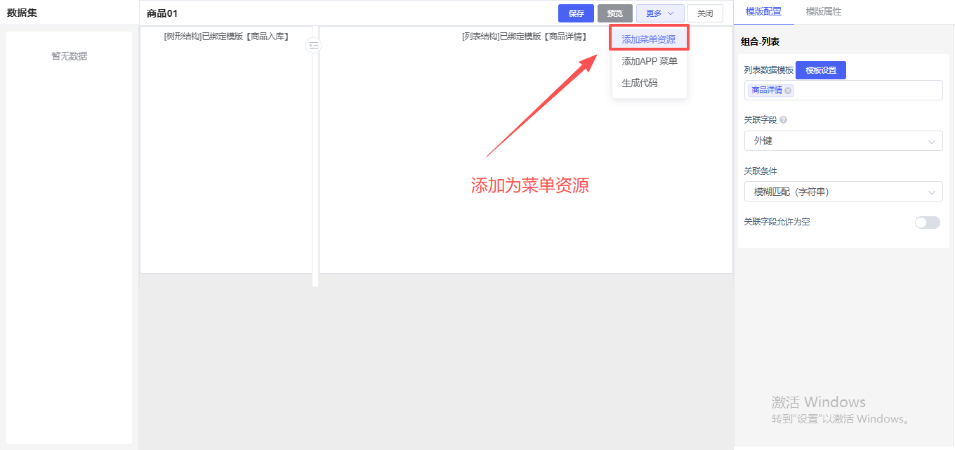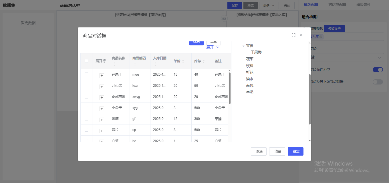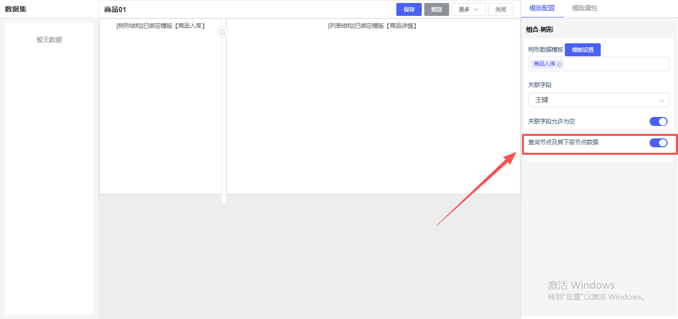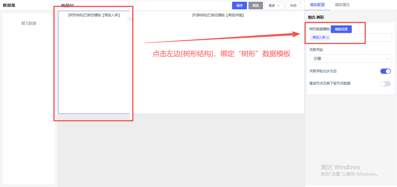 树形先配置完成,数据模板列表数据,配置完成。然后再根据关联存储的类型id信息,组合配置实现。