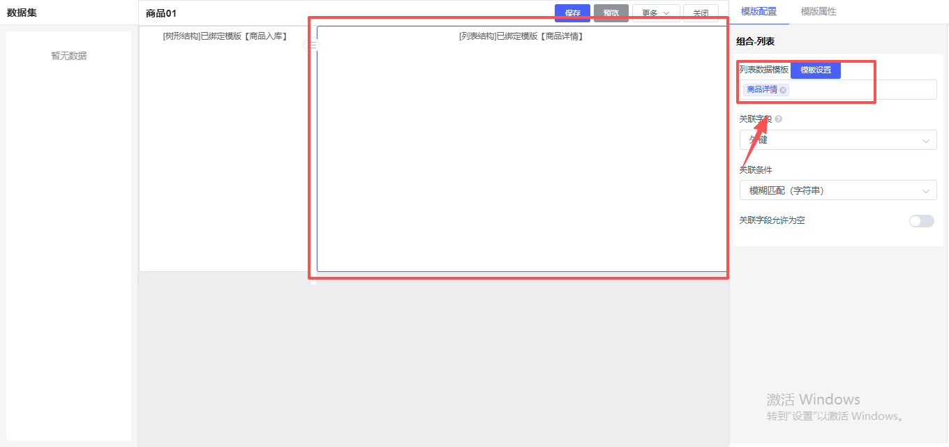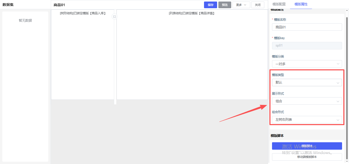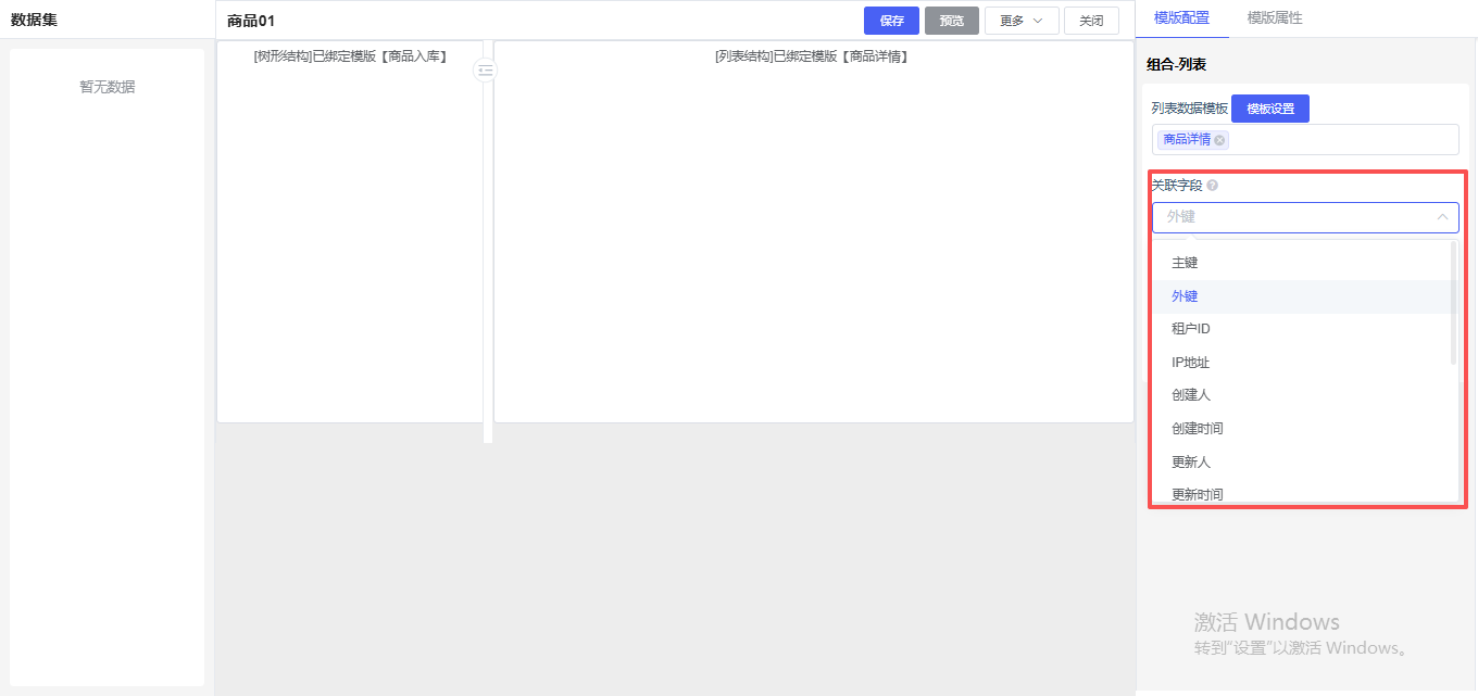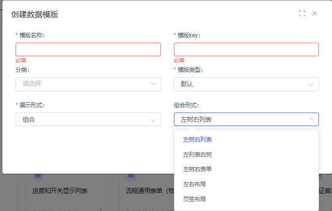 - 此页面配置组合-树形、组合-列表的数据模板和关联字段。通过树形与列表之间有个共同的字段值,组合配置实现。