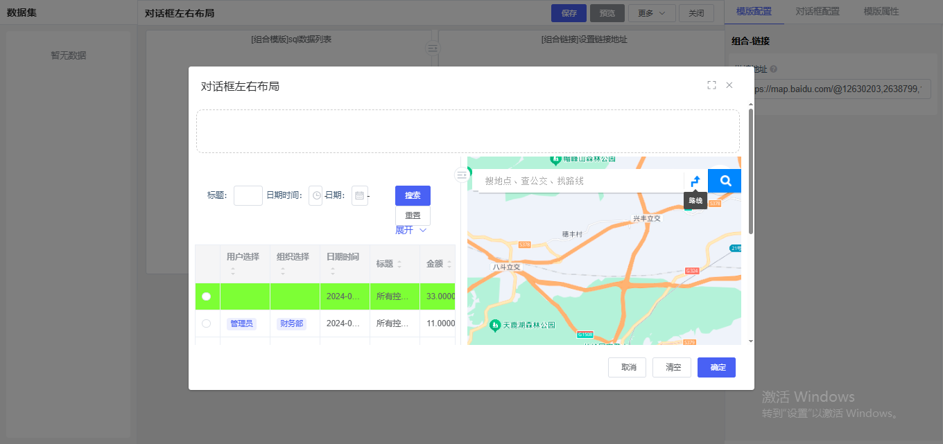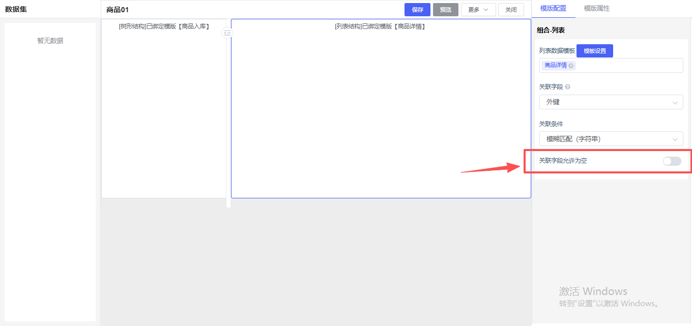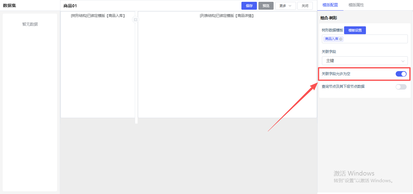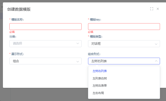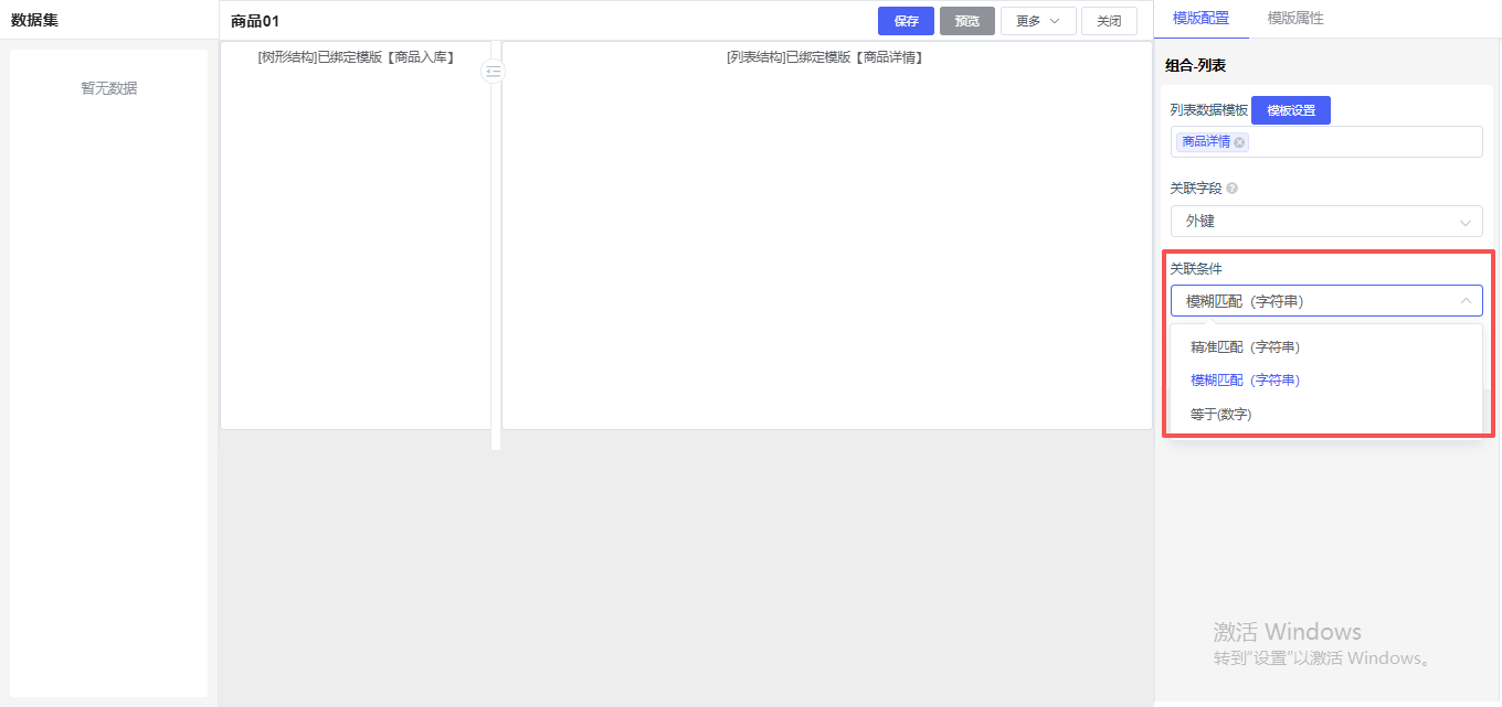 - 此页面配置组合-树形、组合-列表的数据模板和关联字段。通过树形与列表之间有个共同的字段值,组合配置实现。