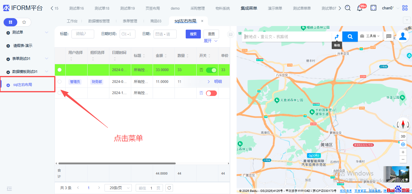 - 菜单中显示组合(左树右列表,左列表右树、左树右表单、左右布局、页签布局)效果,类似『流程管理』或『表单管理』菜单效果。