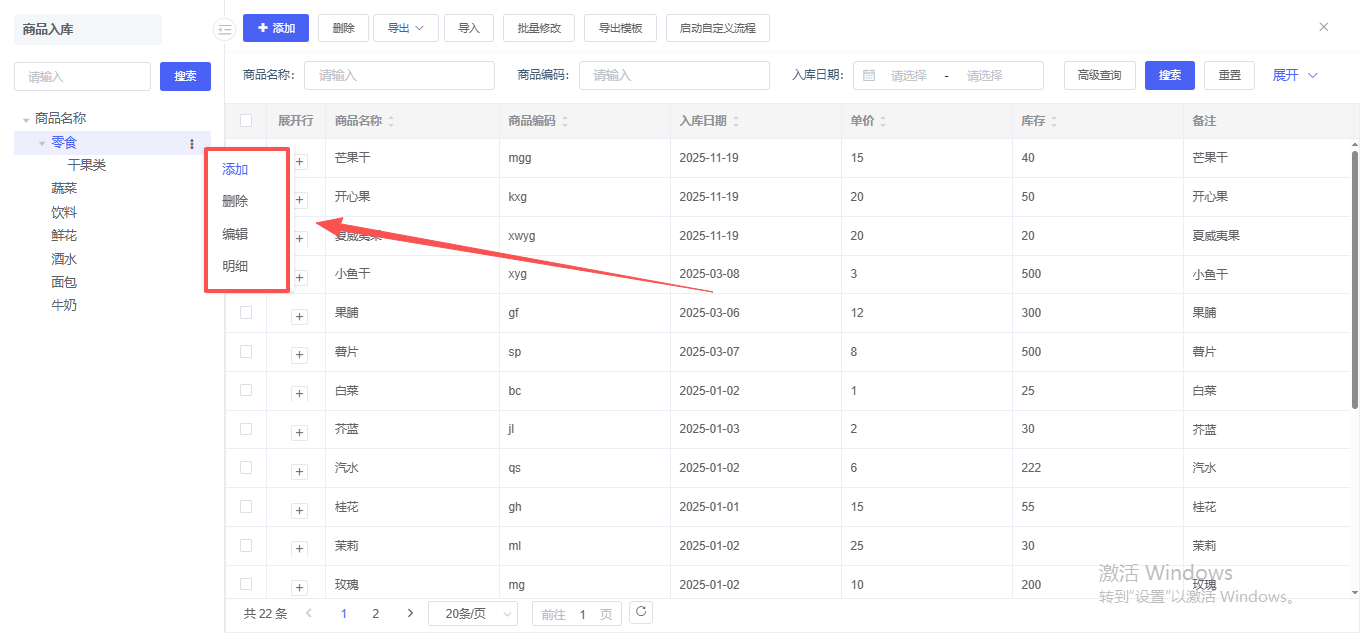 注意:树形的增删改操作需要树形模板设置“ 树形-右键按钮”。列表的增删改等操作是需要在列表模板设置列表-功能按钮。