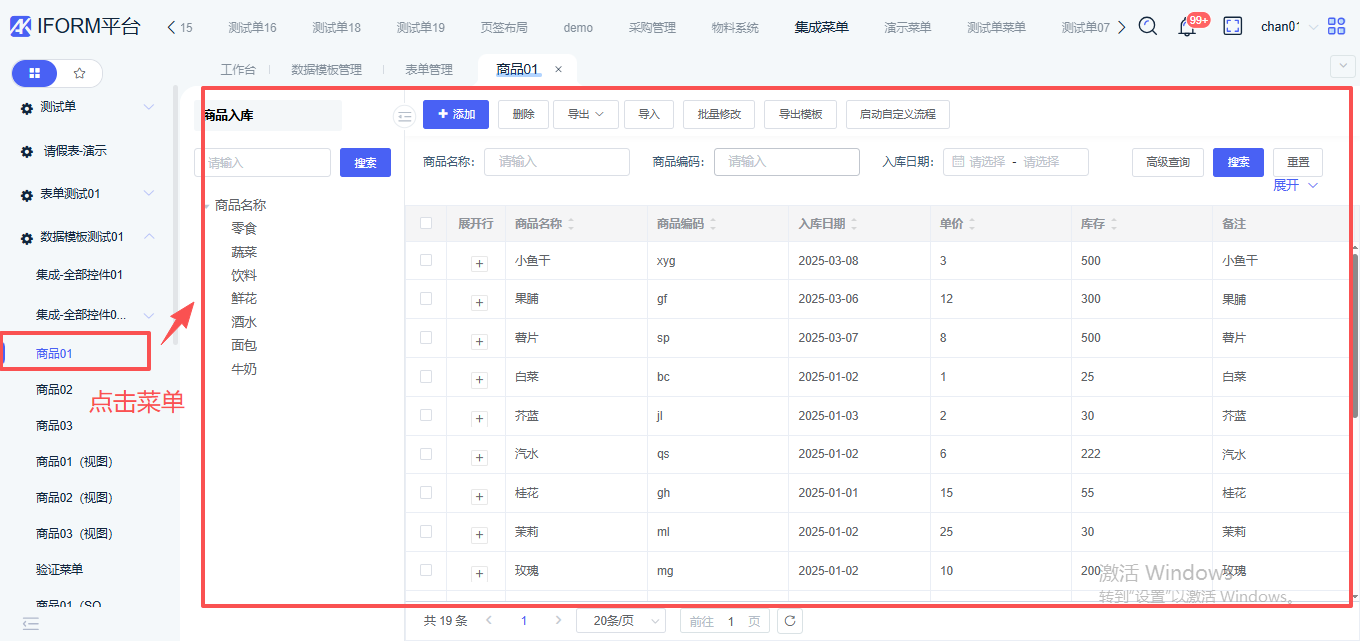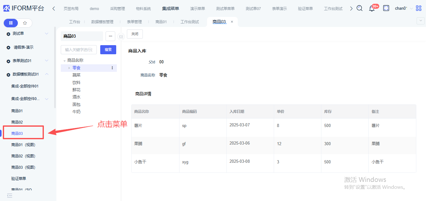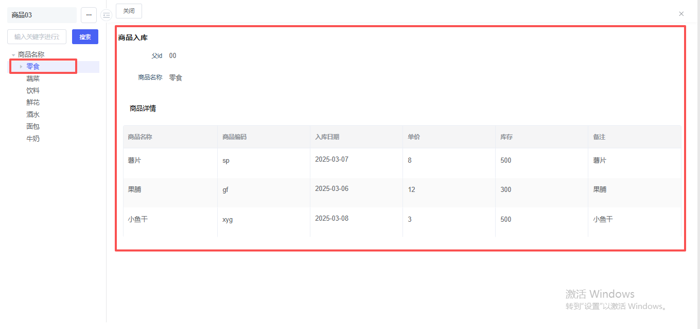 - 预览查看数据,选择点击左侧的树形数据,可查看树形数据对应的表单数据。