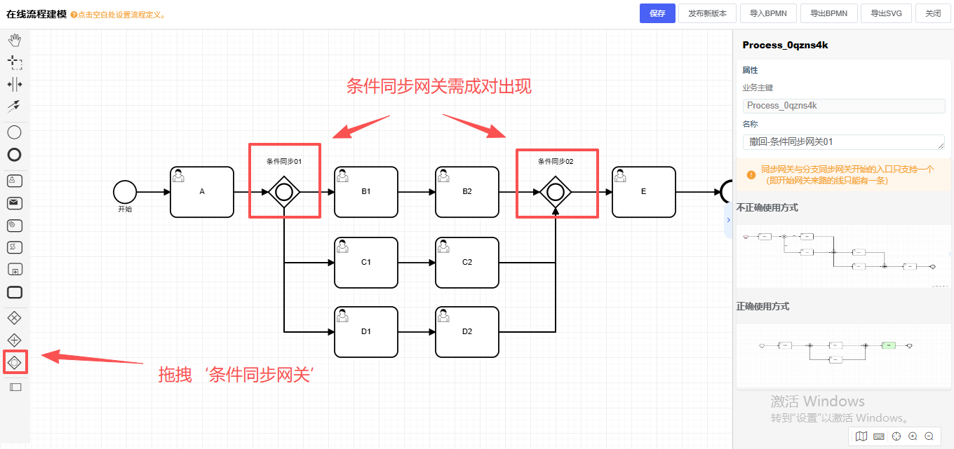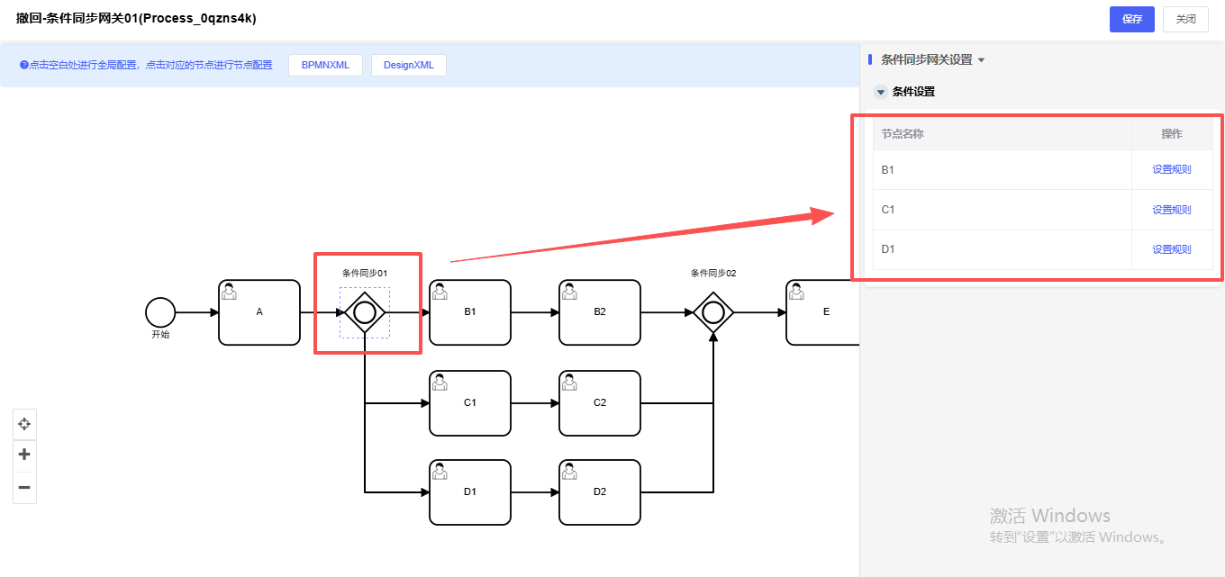 2、点击“在线流程建模”按钮,进入在线流程设计操作页面,设置“条件同步网关流程”,如下图:
